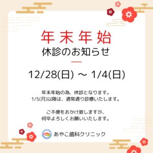 皆さまこんにちは。元住吉駅のあやこ歯科クリニックです。 年末年始休診の予定をお知らせします。